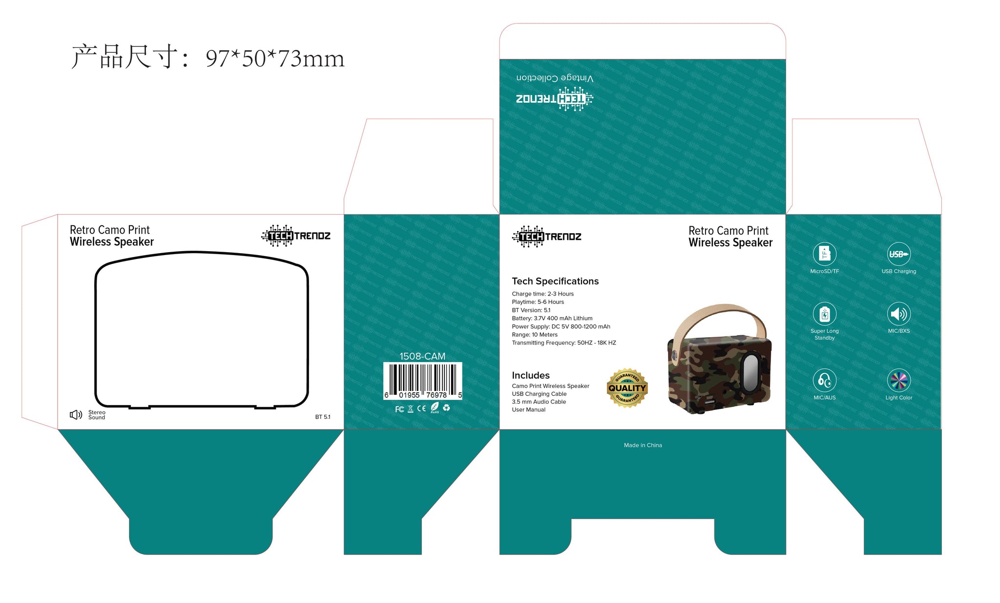 Enjoy your tunes with this Camo Print Bluetooth Vintage Speaker. It delivers crisp, clear sound and keeps the party going longer with its long-lasting battery. Inside the box, you’ll find the speaker, a charging cable, an aux audio cable, and a handy instruction manual to get you started.