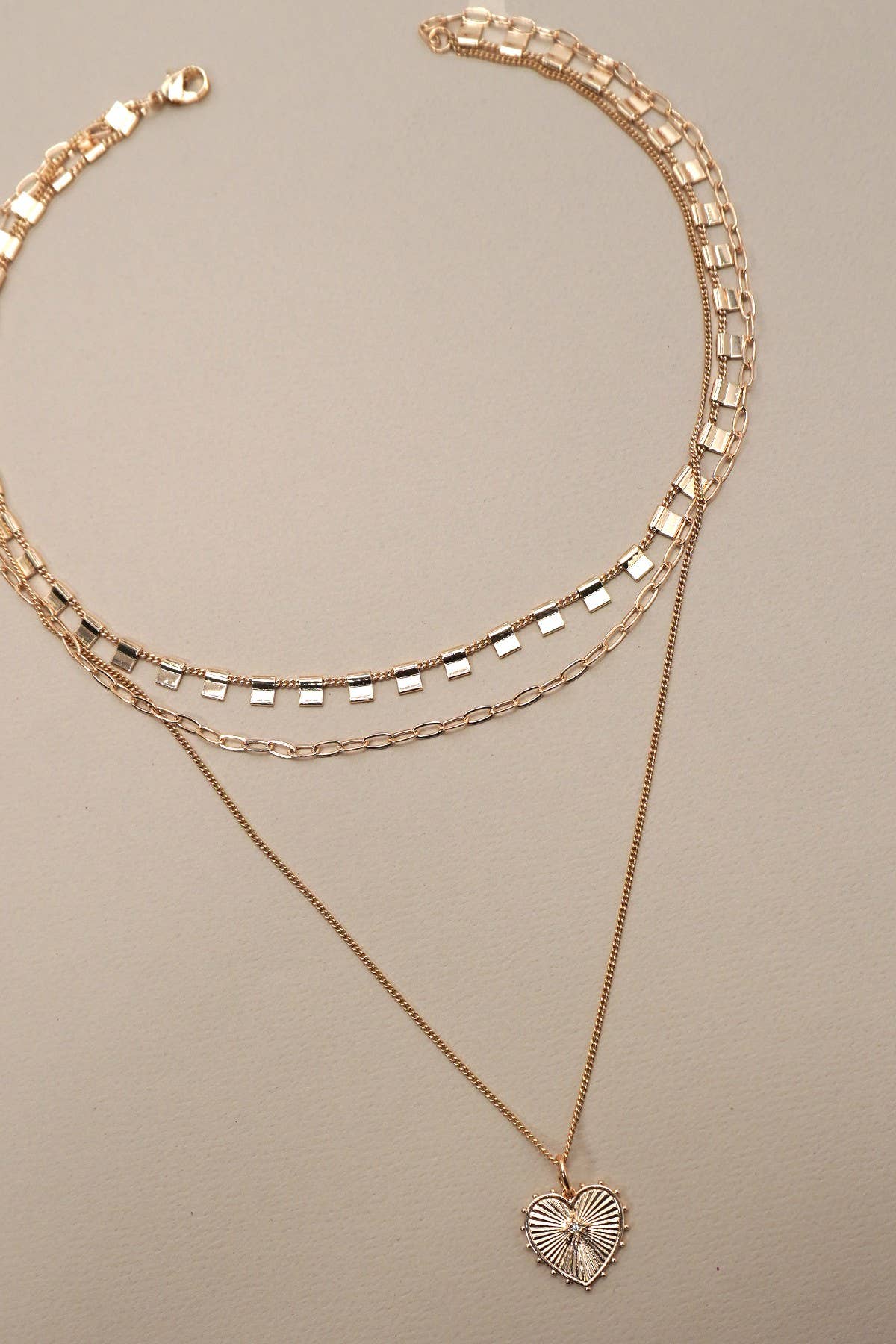 This charming multi-layered necklace features delicate chains sprinkled with etched heart charms that add a textured, handmade vibe. With adjustable lengths of 15", 17", and 18" plus a 3" extension, it’s designed to fit just right. Each heart charm varies around 0.75" in size, shining in a rich gold-plated finish. Lead and nickel free, with a double E-coating to keep the sparkle alive, this playful piece fastens securely with a lobster claw clasp. Perfect for adding a sweet touch to any outfit!
